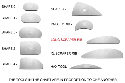 The smooth edge of the Long Scraper works great for throwing, and the toothy edge is fantastic for scoring, scraping, and planing the clay. This is a good tool for sculpting and hand-building.