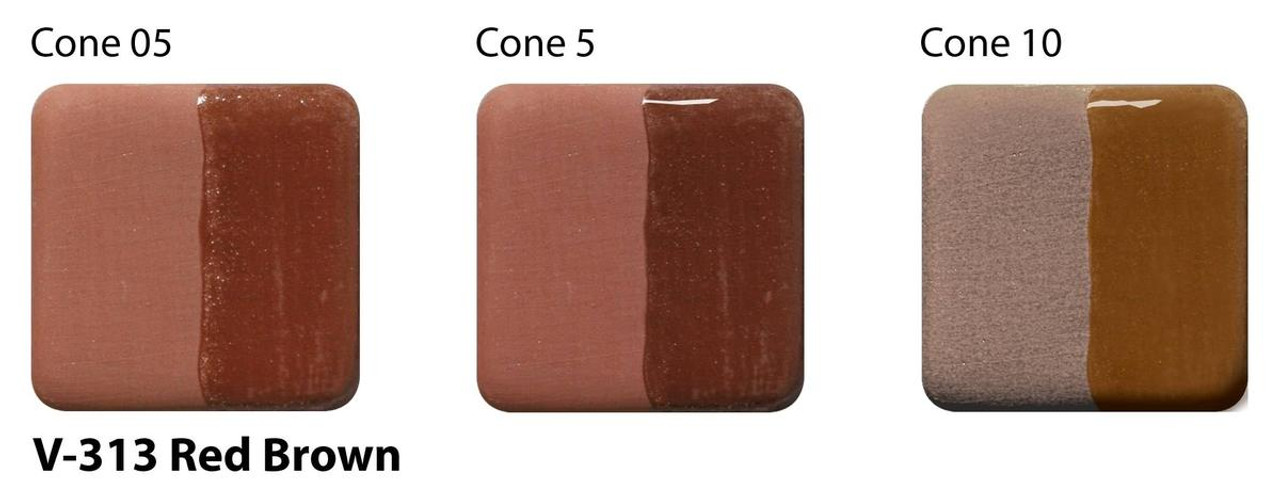 Red Brown Velvet Underglaze is a warm cocoa color that is reddish at cone 05. The color darkens at cone 05, and becomes chocolatey at cone 10. A clear glaze deepens the color of the underglaze significantly at any temperature.